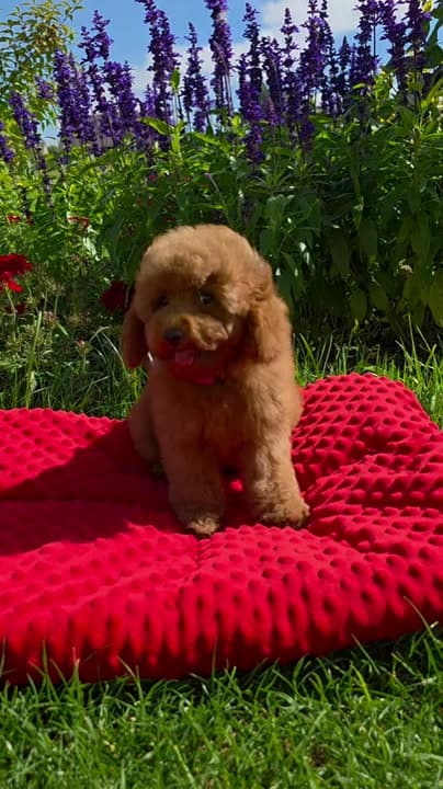 Red toy female. FCI/LKD pedigree. Very nice toy girl, for sweet home. Not for show/breeding. Info .