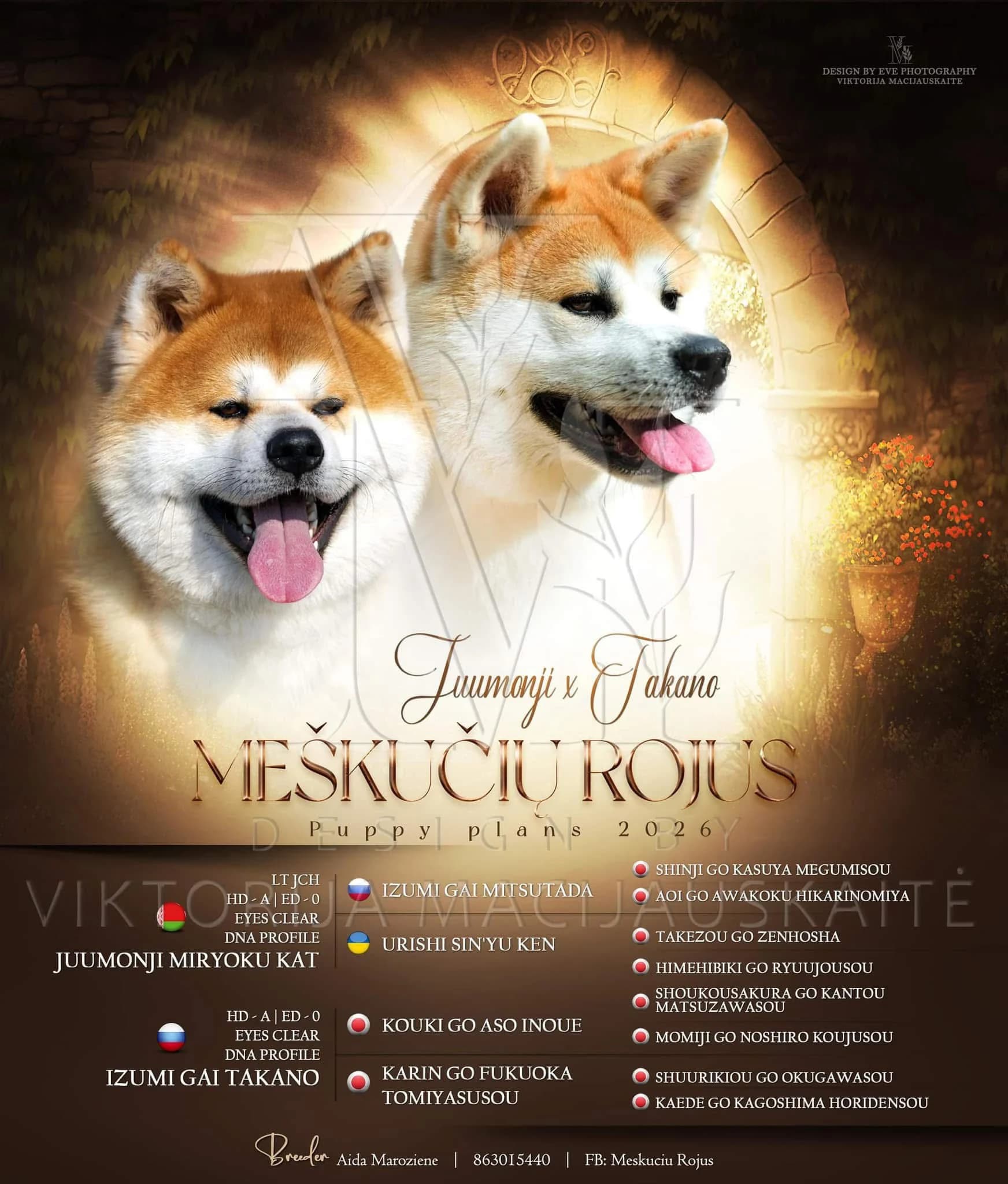Šuniukų tėveliai yra stabilios psichikos, atliktais privalomais sveikatos tyrimais, kurių rezultatai puikūs HD A, ED 0, EYES CLEAR. Mylimi mūsų šeimos nariai, puikiai sutaria su vaikais, nėra agresyvūs. Mamytė itin švelni, visada noriai būna šalia, visur ir visada, visų draugė ir kompanionė. A turime mergaičių ir berniukų. Abu tėvai turi puikius įvertinimus parodose. Tėvų platesnė informacija Šuniukai į naujus namus iškeliaus turėdami: -FCI kilmės dokumentus -mikročipą -pagal amžių skirtomis vakcinacijomis ir ES gyvūno pasu -pirkimo - pardavimo sutartimi - šuniuko kraiteliu. Šuniukai turi nepaprastą dovaną – jie myli visa širdimi, be sąlygų ir be ribų. Jei suteiksi jam galimybę, jis taps tavo ištikimiausiu draugu, kuris visada bus šalia – ir džiaugsme, ir liūdesyje. Atverk savo namus ir širdį. Galbūt būtent čia prasidės jo laiminga istorija. 🐾❤️ Galima rezervacija, kilmingų japonų akitos šuniukų! Su kilmės dokumentais!
