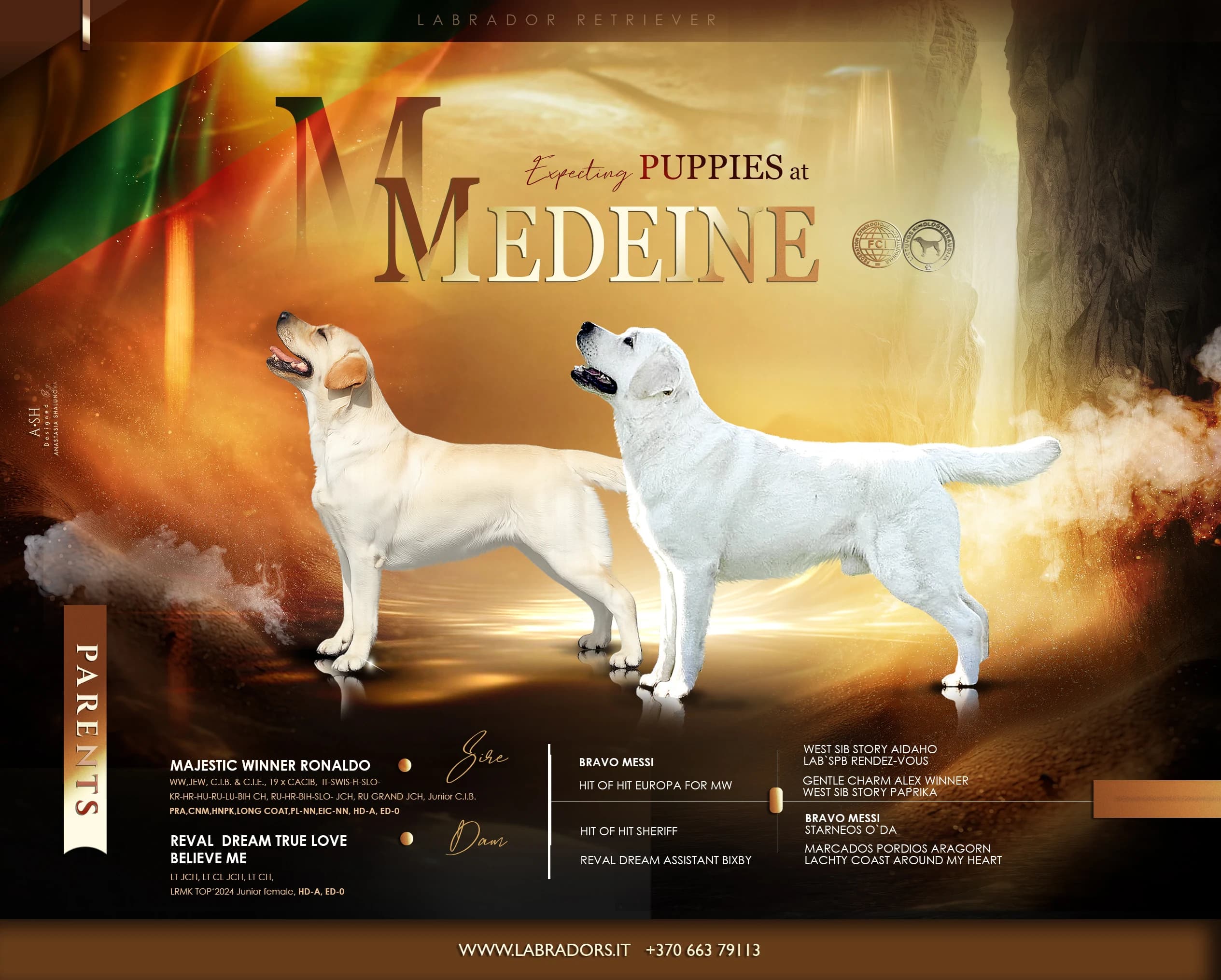 Professional labrador retriever kennel Medeinė FCI. We have wonderfull puppies for dog shows and home. Parents are: World and European junior champion, International Champion, Croatian, Hungarian, Russian, Bosnia Hercegovina, Korean, Slovenian, Italian, Luxembourgh champion MAJESTIC WINNER RONALDO & Lithuanian club junior champion, junior champion, Lithuanian Champion champion, LRMK TOP'2024 junior female REVAL DREAM TRUE LOVE BELIEVE ME. Puppies will have Pedigree documents, European pet passport, mikro-chip, vaccinations from rabbies, dehelmintizated. Good health is inherited from parents, which have analysis of eyes and elbows. We breed labradors for more than 25 years and participate in dog shows constantly. We provide all information about *choosing suitable puppy for you, *preparing for dog shows, *proper upbringing. More information: web page: www.labradors.lt phone: e-mail: